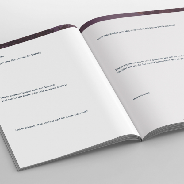 Dokumentiere 6 Sitzungen auf perfekt zugeschnittenen Doppelseiten und beobachte, wie sich lose Gedanken in handfeste Ergebnisse verwandeln. Mache Deine Fortschritte sichtbar und sorge dafür, dass kein wertvoller Impuls mehr verloren geht.